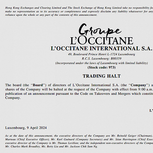 4月9日,法国护肤品集团欧舒丹L'OCCITANE(00973.HK)在港交所发布公告称:“上午9时起短暂停牌,以待发布一则根据公司收购及合并守则并构成内幕消息的公告。”截至零售商业财经发稿前,欧舒丹在港交所仍处于停牌的状态。