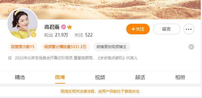 高君雨抖音显示“因违反社区规定被禁止关注。”