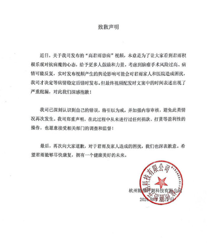 大家好,我是君雨的妈妈,正如大家所知,小雨生了一场非常严重的病,目前还在康复中。君雨全网的账号一直由签约公司在运营,我们确实无暇管理。视频原本是想记录小雨病情,给关心的粉丝一个交代,但公司在发布过程中,运营上出现了严重的问题,给大家造成非常大的误解,这也令我们非常气愤和抱歉,我们也已经与公司交涉决定停止发布君雨相关视频。目前君雨还需要进一步康复,非常感谢大家的关心,代表君雨谢谢大家。