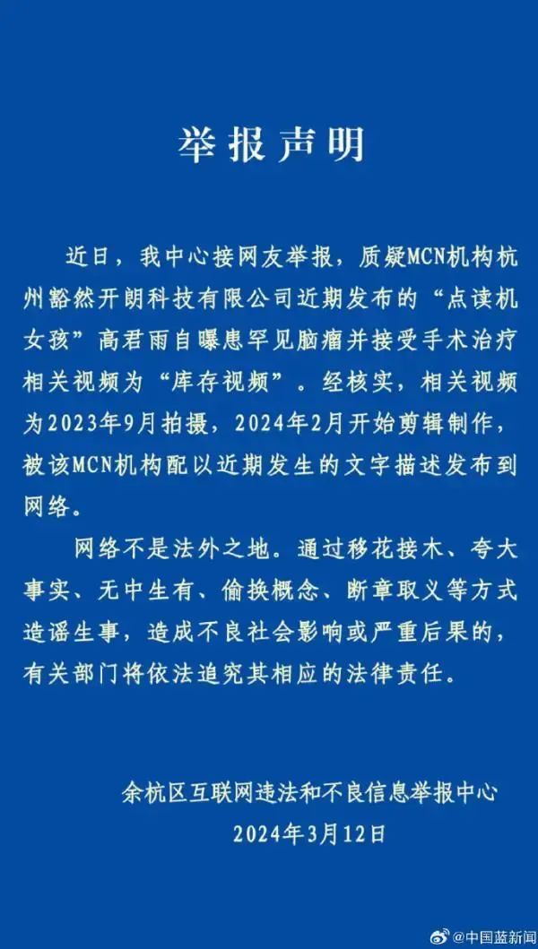 举报声明称,近日,该中心接网友举报,质疑MCN机构杭州豁然开朗科技有限公司近期发布的“点读机女孩”高君雨自曝患罕见脑瘤并接受手术治疗相关视频为“库存视频”。