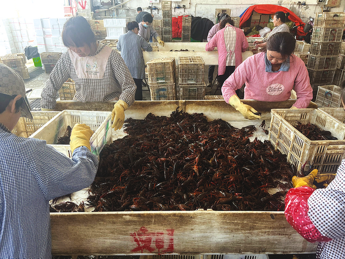 4月24日,周谷堆市场内工人正忙着分拣小龙虾。