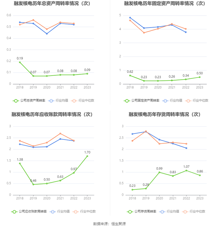营运能力方面,2023年,公司公司总资产周转率为0.09次,上年同期为0.08次(2022年行业平均值为0.52次,公司位居同行业22/23);固定资产周转率为0.50次,上年同期为0.34次(2022年行业平均值为3.78次,公司位居同行业22/23);公司应收账款周转率、存货周转率分别为1.70次、0.86次。