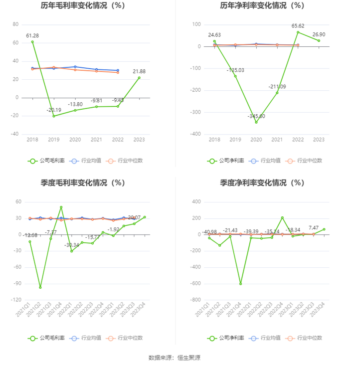 2023年,公司毛利率为21.88%,同比上升31.33个百分点;净利率为26.90%,较上年同期下降38.72个百分点。从单季度指标来看,2023年第四季度公司毛利率为32.42%,同比上升28.19个百分点,环比上升12.35个百分点;净利率为65.78%,较上年同期下降143.25个百分点,较上一季度上升58.31个百分点。