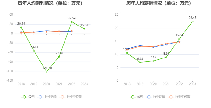 截至2023年末,公司员工总数为1307人,人均创收56.99万元,人均创利15.61万元,人均薪酬22.45万元,较上年同期分别变化20.38%、-58.48%、40.86%。