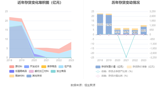从存货变动来看,截至2023年年末,公司存货账面价值为8.61亿元,占净资产的18.52%,较上年末增加3.74亿元。其中,存货跌价准备为1.75亿元,计提比例为16.9%。