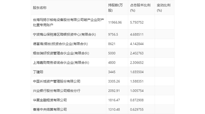 年报显示,2023年年末公司十大流通股东中,新进股东为宁波梅山保税港区璐银投资中心(有限合伙)、德富海(烟台)投资合伙企业(有限合伙)、烟台瑞好投资管理合伙企业(有限合伙)、上海嘉勋商务咨询合伙企业(有限合伙)、丁建阳,取代了三季度末的厦门国际银行股份有限公司、中国信达资产管理股份有限公司、郭子豪、烟台银行股份有限公司、上海浦东发展银行股份有限公司青岛分行。在具体持股比例上,香港中央结算有限公司持股有所下降。
