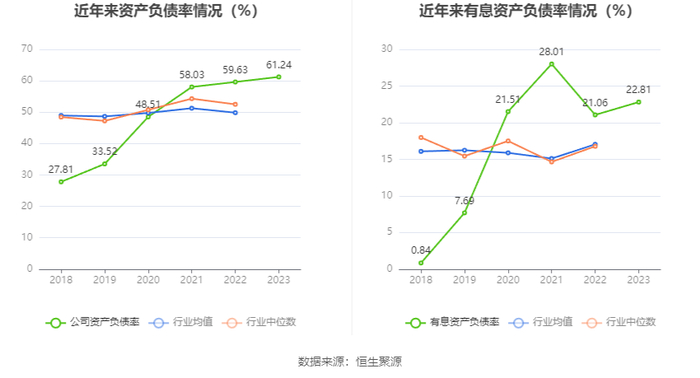 在偿债能力方面,公司2023年年末资产负债率为61.24%,相比上年末上升1.61个百分点;有息资产负债率为22.81%,相比上年末上升1.75个百分点。