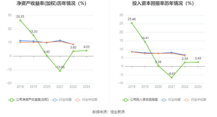数据显示,2023年公司加权平均净资产收益率为4.03%,较上年同期增长0.43个百分点;公司2023年投入资本回报率为2.43%,较上年同期增长0.09个百分点。