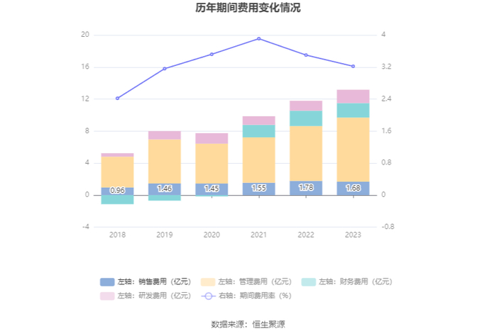 2023年,公司期间费用为13.17亿元,较上年同期增加1.38亿元;但期间费用率为3.22%,较上年同期下降0.28个百分点。其中,销售费用同比下降5.53%,管理费用同比增长16.87%,研发费用同比增长34.83%,财务费用同比下降5.73%。