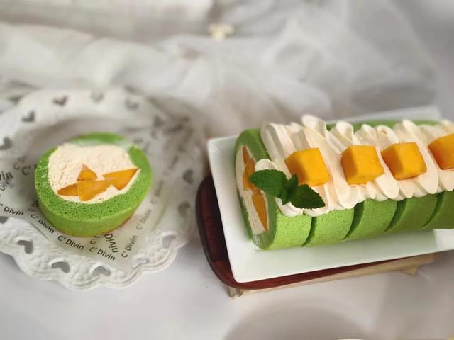 7.切块,给蛋糕卷上加奶油装饰,然后摆上芒果块,完成。