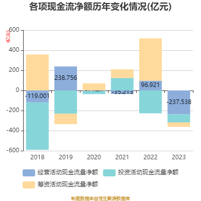 2023年,公司经营活动现金流净额为-237.54亿元,同比减少334.46亿元;筹资活动现金流净额-43.00亿元,同比减少464.15亿元;投资活动现金流净额-81.25亿元,上年同期为-227.32亿元。