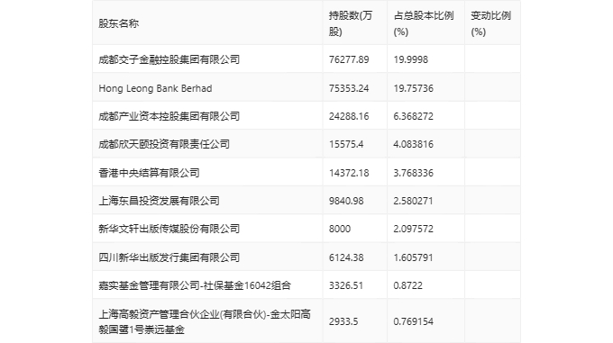 年报显示,2023年年末公司十大流通股东中,新进股东为上海高毅资产管理合伙企业(有限合伙)-金太阳高毅国鹭1号崇远基金,取代了三季度末的四川汇通建设工程有限公司、四川汉龙高新技术开发有限公司。在具体持股比例上,四川新华出版发行集团有限公司持股有所上升,成都交子金融控股集团有限公司、HongLeongBankBerhad、成都产业资本控股集团有限公司、成都欣天颐投资有限责任公司、香港中央结算有限公司、新华文轩出版传媒股份有限公司持股有所下降。
