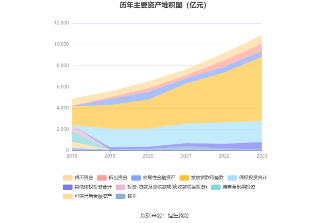 资产重大变化方面,截至2023年年末,公司发放贷款和垫款较上年末增加28.89%,占公司总资产比重上升4.28个百分点;债权投资合计较上年末减少2.33%,占公司总资产比重下降3.93个百分点;其他债权投资合计较上年末增加56.05%,占公司总资产比重上升1.52个百分点;买入返售金融资产较上年末减少93.19%,占公司总资产比重下降0.86个百分点。
