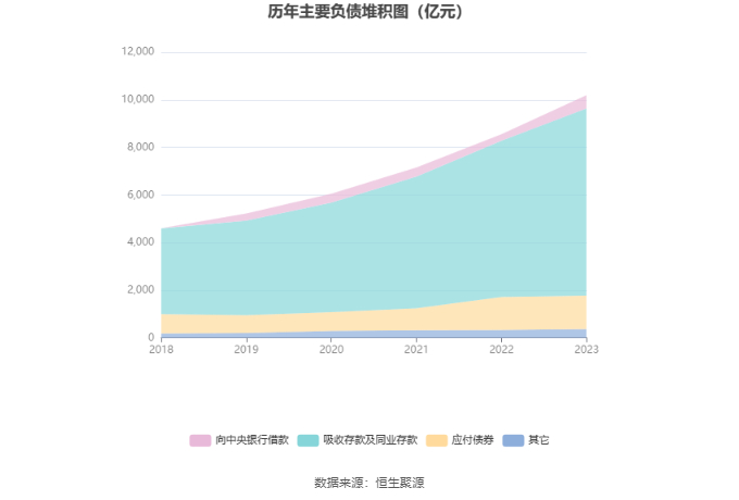 负债重大变化方面,截至2023年年末,公司吸收存款及同业存款较上年末增加19.88%,占公司总资产比重上升0.58个百分点;向中央银行借款较上年末增加101.39%,占公司总资产比重上升2.07个百分点;拆入资金较上年末增加202.84%,占公司总资产比重上升0.34个百分点;应付债券较上年末增加1.51%,占公司总资产比重下降2.21个百分点。