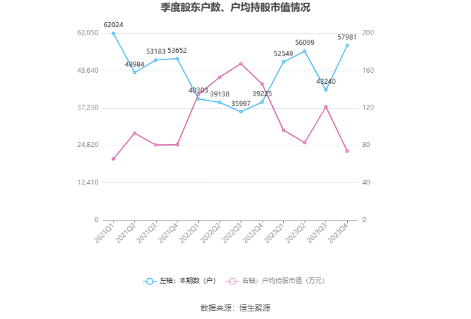 筹码集中度方面,截至2023年年末,公司股东总户数为5.8万户,较三季度末增长了1.47万户,增幅34.09%;户均持股市值由三季度末的121.37万元下降至74.07万元,降幅为38.97%。