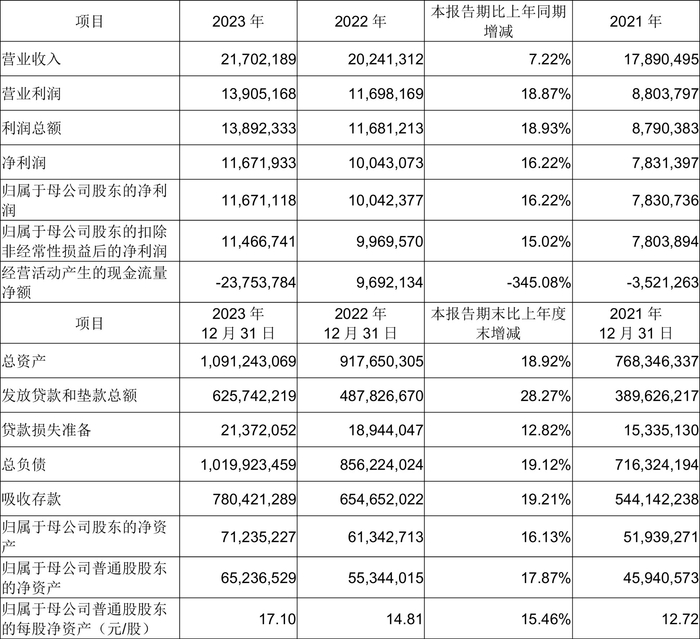 成都银行(601838)4月25日披露2023年年报。2023年,公司实现营业总收入217.02亿元,同比增长7.22%;归母净利润116.71亿元,同比增长16.22%;扣非净利润114.67亿元,同比增长15.02%;经营活动产生的现金流量净额为-237.54亿元,上年同期为96.92亿元;报告期内,成都银行基本每股收益为3.01元,加权平均净资产收益率为18.78%。公司2023年年度利润分配预案为:拟向全体股东每10股派8.968元(含税)。