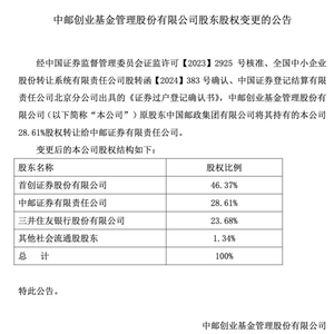 据公告,经中国证券监督管理委员会证监许可【2023】2925号核准、全国中小企业股份转让系统有限责任公司股转函【2024】383号确认、中国证券登记结算有限责任公司北京分公司出具的《证券过户登记确认书》,中邮创业基金管理股份有限公司(以下简称“中邮基金”)原股东中国邮政集团有限公司(以下简称“中国邮政集团”)将其持有的本公司28.61%股权转让给中邮证券有限责任公司(以下简称“中邮证券”)。