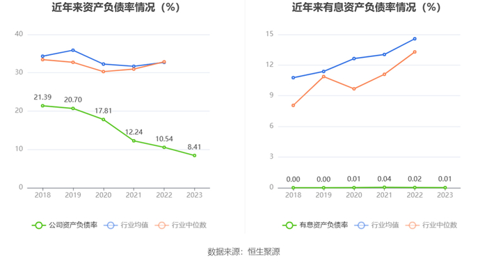 在偿债能力方面,公司2023年年末资产负债率为8.41%,相比上年末下降2.13个百分点;有息资产负债率为0.01%,相比上年末下降0.01个百分点。