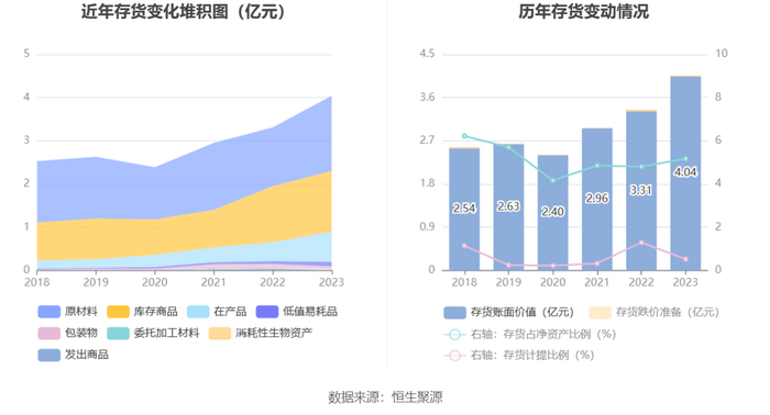 从存货变动来看,截至2023年年末,公司存货账面价值为4.04亿元,占净资产的5.17%,较上年末增加7264.67万元。其中,存货跌价准备为209.78万元,计提比例为0.52%。