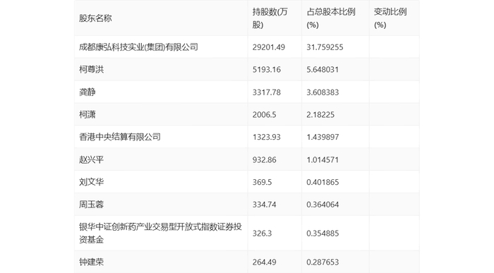 年报显示,2023年年末公司十大流通股东中,持股最多的为成都康弘科技实业(集团)有限公司,占比31.76%。十大流通股东名单相比2023年三季报维持不变。在具体持股比例上,香港中央结算有限公司、银华中证创新药产业交易型开放式指数证券投资基金持股有所上升,刘文华持股有所下降。