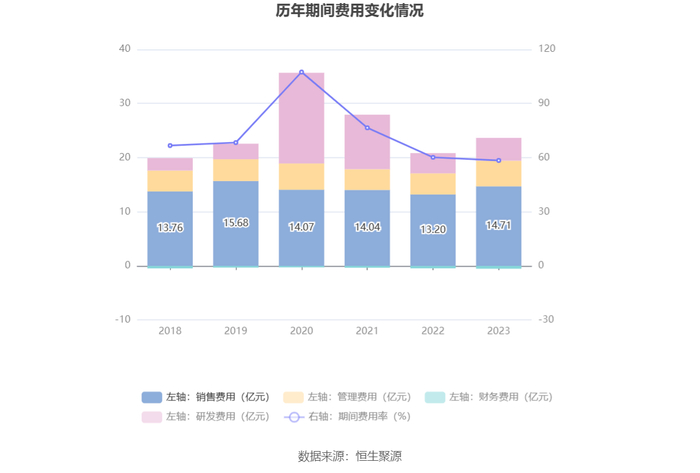 2023年,公司期间费用为23.13亿元,较上年同期增加2.73亿元;但期间费用率为58.44%,较上年同期下降1.74个百分点。其中,销售费用同比增长11.41%,管理费用同比增长21.09%,研发费用同比增长12.75%,财务费用由去年同期的-4494.42万元变为-5235.32万元。