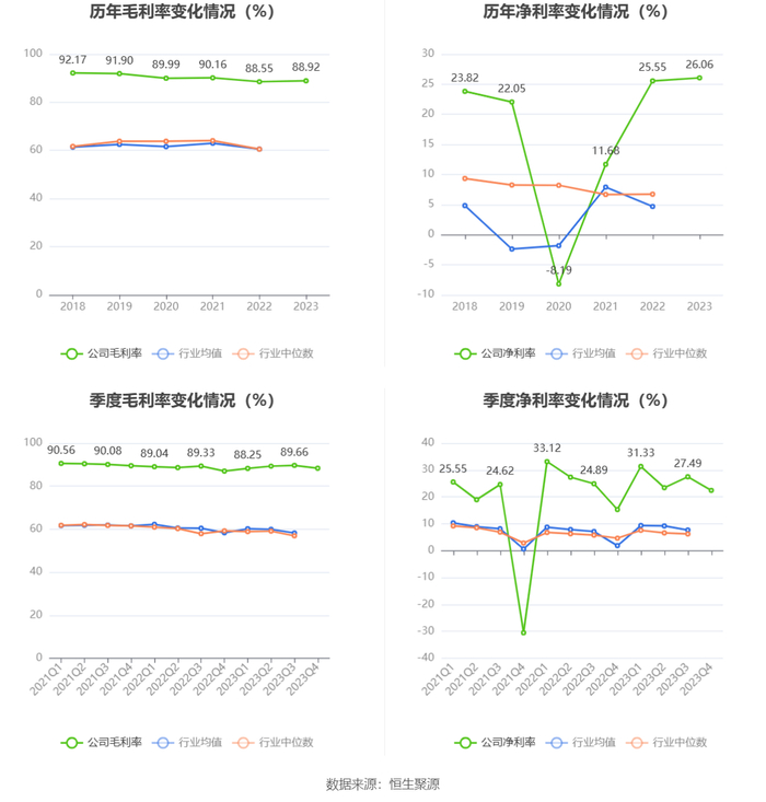 2023年,公司毛利率为88.92%,同比上升0.37个百分点;净利率为26.06%,较上年同期上升0.51个百分点。从单季度指标来看,2023年第四季度公司毛利率为88.32%,同比上升1.32个百分点,环比下降1.34个百分点;净利率为22.42%,较上年同期上升7.13个百分点,较上一季度下降5.07个百分点。