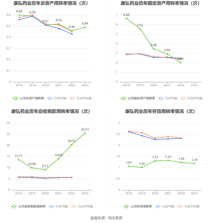 营运能力方面,2023年,公司公司总资产周转率为0.49次,上年同期为0.46次(2022年行业平均值为0.43次,公司位居同行业51/112);公司应收账款周转率、存货周转率分别为25.53次、1.19次。