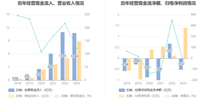 进一步统计发现,2023年公司自由现金流为-9.50亿元,上年同期为-0.56亿元。