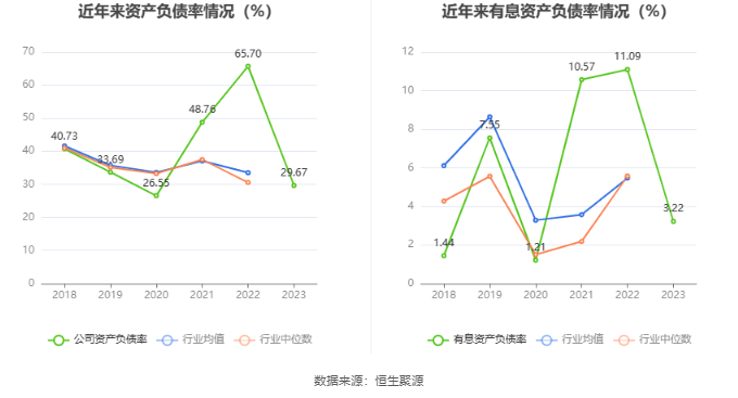 在偿债能力方面,公司2023年年末资产负债率为29.67%,相比上年末下降36.03个百分点;有息资产负债率为3.22%,相比上年末下降7.87个百分点。