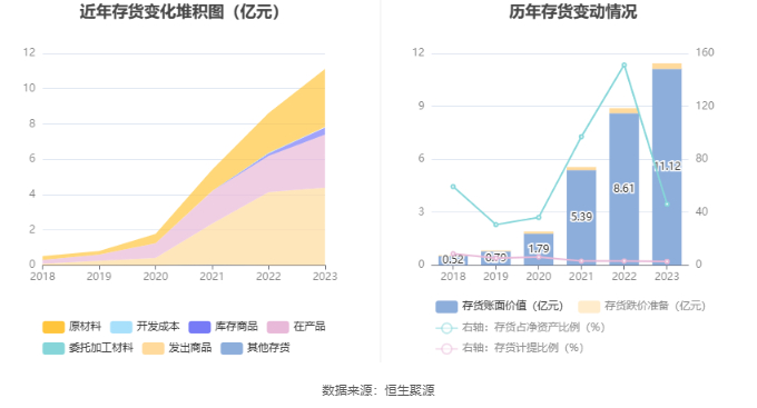 从存货变动来看,截至2023年末,公司存货账面价值为11.12亿元,占净资产的46.12%,较上年末增加2.51亿元。其中,存货跌价准备为3229.53万元,计提比例为2.82%。