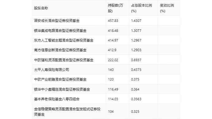 年报显示,2023年年末公司十大流通股东中,新进股东为银华中小盘精选混合型证券投资基金、基本养老保险基金八零四组合,取代了三季度末的基本养老保险基金一六零六一组合、德邦半导体产业混合型发起式证券投资基金。在具体持股比例上,诺安成长混合型证券投资基金、银华集成电路混合型证券投资基金、东方人工智能主题混合型证券投资基金、南方信息创新混合型证券投资基金、中欧瑾和灵活配置混合型证券投资基金、中欧产业前瞻混合型证券投资基金、金信稳健策略灵活配置混合型发起式证券投资基金持股有所上升。