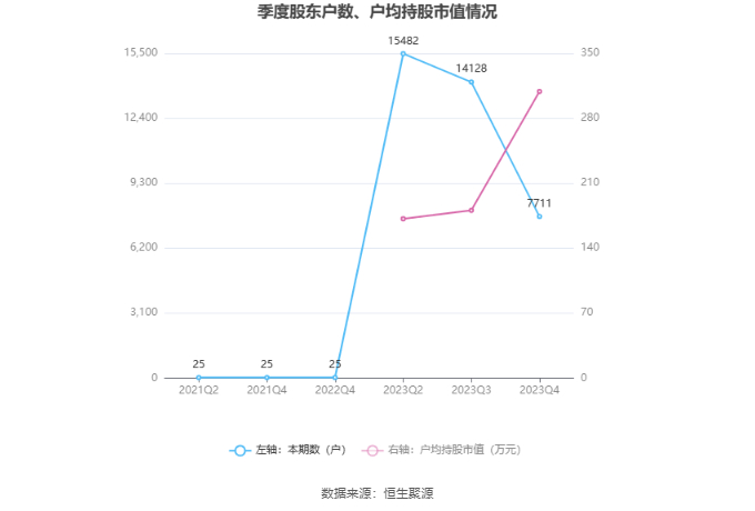 筹码集中度方面,截至2023年年末,公司股东总户数为7711户,较三季度末下降了6417户,降幅45.42%;户均持股市值由三季度末的180.75万元上升至308.88万元,增幅为70.89%。