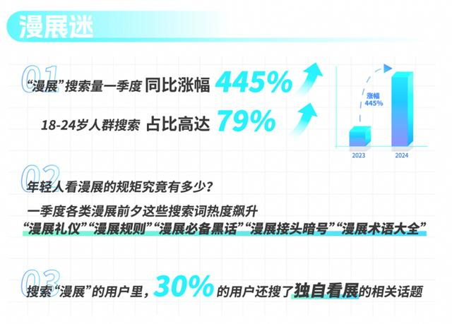 作为二次元爱好者的盛会,各地漫展也成了年轻人假期出游的目的地。一季度“漫展”搜索量同比涨幅445%,18—24岁年轻人占比79%。除了搜索展出相关信息外,漫展迷还会在漫展前恶补漫展礼仪规矩,一季度节假日前夕,“漫展礼仪”“漫展规则”“漫展必备黑话”“漫展接头暗号”“漫展术语大全”等相关知识的搜索热度飙升。近三成用户还关注了独自看展的相关话题。