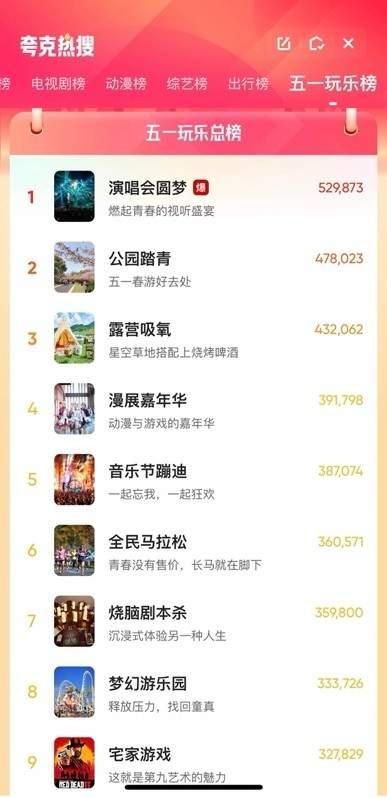 在一场Live中找到感动与共鸣、逛漫展与喜欢的角色集邮合照、用一顶帐篷邂逅诗和远方、全国打卡马拉松解码City Run……在夸克热搜五一玩乐榜上,演唱会圆梦、公园踏青、露营吸氧、漫展嘉年华、音乐节蹦迪、全民马拉松、梦幻游乐园、博物馆逛展等内容成为了年轻人热搜的主力出游方向。