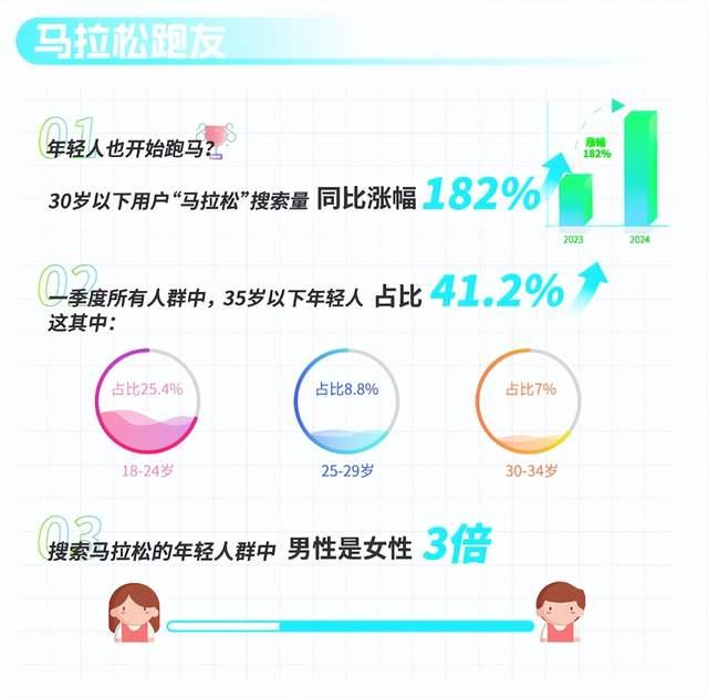 马拉松不只是中年人的专利,也同样让年轻人上头。夸克数据显示,一季度30岁以下用户“马拉松”搜索量同比上涨182%,其中18—24岁年轻人占比超61%,成为跑马主力。马拉松相关搜索中,赛事科普和健康知识占比最大,热搜问题包括“马拉松多少公里”“国内马拉松排名”“马拉松跑后面的人吃亏吗”“马拉松后怎么快速恢复”“马拉松膝盖贴怎么贴”“跑马拉松前吃什么”等。