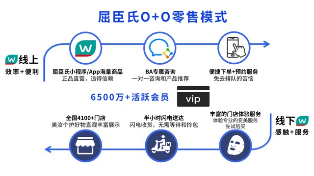 其中最具代表性的便是屈臣氏于2018年开启的O+O(线下及线上)转型策略,这一策略简单来说就是从消费者需求出发,将门店与小程序、企业微信、社群等多元化数字触点进行融合,线上与线下贯通一体,为用户打造消费体验闭环,从而提高顾客留存与复购率。
