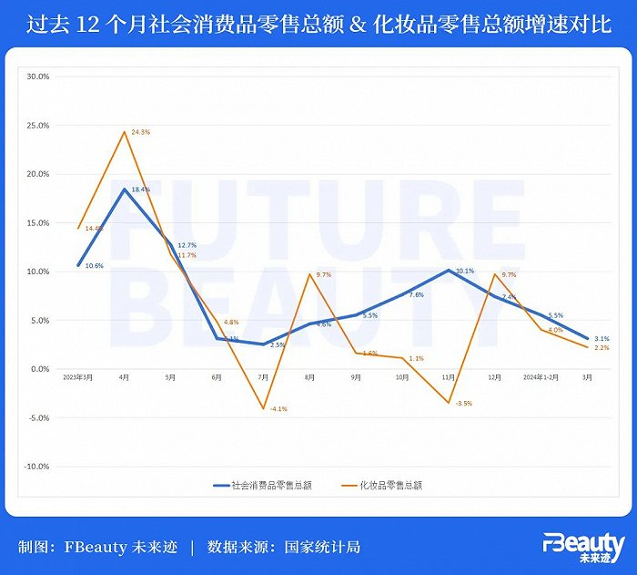 就美妆市场来看,根据国家统计局发布的2024年3月份社会消费品零售总额情况,化妆品在今年一季度的总销售额达1086亿元,同比增长3.4%,增速低于总体零售大盘。可以预见的是,化妆品市场似乎正迅速从“慢增长时代”走向“微增长时代”,甚至未来还要做好迎接“0增长时代”的准备。
