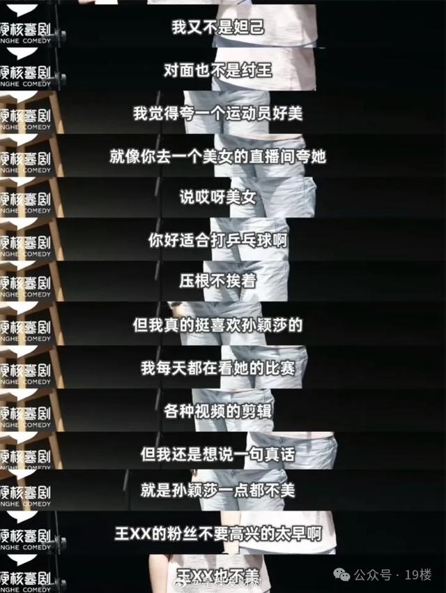 其中涉及到中国乒乓球运动员孙颖莎和王曼昱的部分成为了争议的焦点。表演中,演员提到:“我不明白为什么要夸一个运动员好美”、“孙颖莎一点都不美”、“王曼昱也不美”。