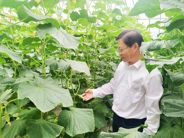 张圣平正在查看“中农脆玉3号”黄瓜长势。