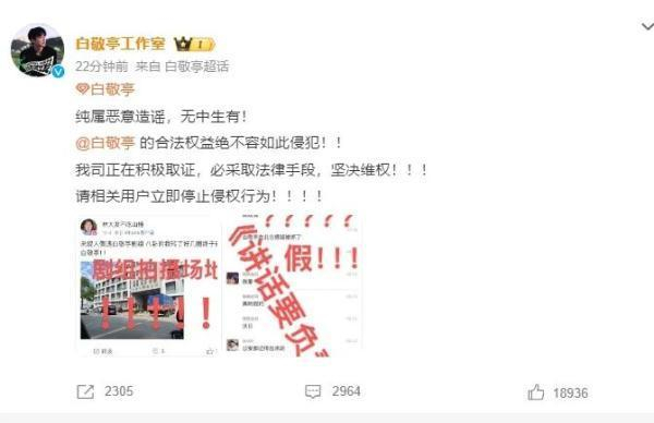 近日有消息称:演员白敬亭在北仑嫖娼被抓。白敬亭工作室官方回应:纯属恶意造谣,无中生有!@白敬亭 的合法权益绝不容如此侵犯!!我司正在积极取证,必采取法律手段,坚决维权!!!请相关用户立即停止侵权行为!!!!