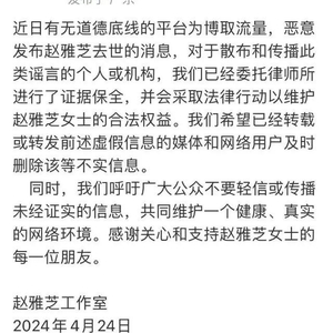 其工作室表示“近日有无道德底线的平台为博取流量,恶意发布赵雅芝去世的消息,对于散布和传播此类谣言的个人或机构,我们已经委托律师所进行了证据保全,并会采取法律行动以维护赵雅芝女士的合法权益。我们希望已经转载或转发前述虚假信息的媒体和网络用户及时删除该等不实信息。”