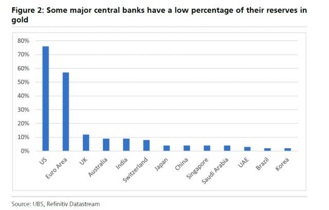 发达市场央行从金本位制时代就持有大量黄金,但主要经济体央行也有不少央行黄金储备占总储备的比重不高(日本、韩国)。