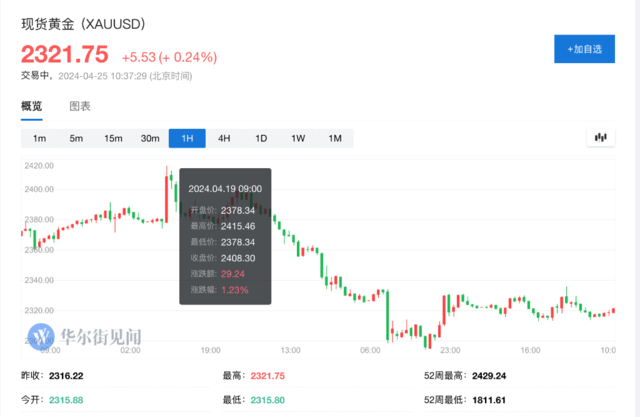 现货黄金价格出现回调,截至发稿,现货黄金小幅上涨0.24%至2321.75,本周以来金价累计跌超76美元。期货方面,COMEX黄金期货价格4月22日跌幅超过3%,4月23日再度回落,跌幅超过1%,截至发稿,COMEX黄金期货跌0.56%,报2328.90美元/盎司。