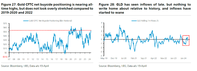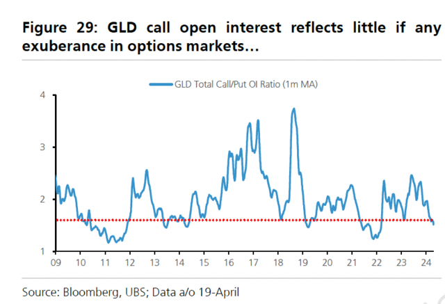 瑞银在报告中称,从某些指标来看,黄金的市场定位(即投资者的整体持仓情况)较高,但并未表现出过度乐观的情绪。