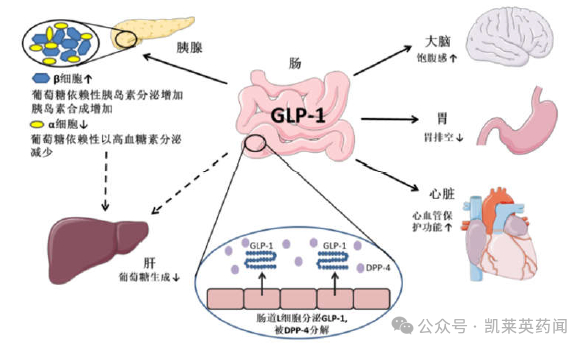 GLP-1是肠道L 细胞分泌的一种多肽类激素,属于肠促胰素,进食可以刺激GLP-1RA 的释放。肠促胰岛素家族主要有GLP-1 和葡萄糖依赖性促胰岛素多肽(GIP)。人体分泌的天然的GLP-1 半衰期短,只有2-3 分钟,很容易被体内的二肽基肽酶-4(DDP-4)分解。GLP-1RA 通过激活与其特异性结合的受体,以葡萄糖浓度依赖的方式增强胰岛素(胰岛β细胞)的合成,抑制胰高糖素分泌,并能够延缓胃排空,通过中枢性的食欲抑制减少进食量,参与机体血糖稳态调节,达到降低血糖、减轻体重等作用。