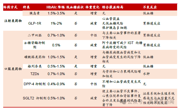 目前全球主要的糖尿病治疗药物共有九类:胰岛素类、双胍类、α-糖苷酶抑制剂类、磺脲类、噻唑烷二酮类(TZDs)、格列奈类、GLP-1RA 类、DPP-4 抑制剂类和SGLT-2 抑制剂类。胰岛素使用时间最久,但其注射给药频繁并有增重和低血糖风险,近几年市场规模下降。传统口服药中,二甲双胍是糖尿病初期首选产品,一般会与其它糖尿病治疗药物联用;α-糖苷酶抑制剂降低糖化血红蛋白的幅度较小;SGLT2 抑制剂容易导致泌尿系统感染;磺酰脲类、格列奈类、TZDs 都有低血糖和增重风险。