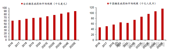 全球糖尿病药物市场规模庞大。根据弗若斯特沙利文报告,全球糖尿病药物市场规模由2016 年的602 亿美元增长到2020年的697 亿美元,到2025 年,全球抗肿瘤药物市场规模预计达到902 亿美元,2020-2025 年CAGR预计为5.3%。中国糖尿病药物市场规模由2016 年的470 亿元增长到2020 年的632 亿元,到2025 年,中国糖尿病药物市场规模预计达到1161 亿元,2020-2025 年CAGR 预计为12.9%。