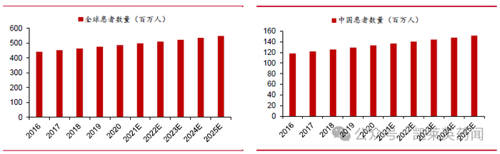 糖尿病是一种以高血糖为特征的代谢性疾病,是全球高发的慢性疾病,根据疾病机理的不同,可以分为1 型糖尿病、2型糖尿病和其他类型糖尿病。其中,2型糖尿病最常见,占比在90%以上。根据弗若斯特沙利文报告,全球糖尿病患者数量由2016年4.4 亿人增长至2020 年4.9 亿人,中国糖尿病患者数量由2016 年1.2 亿人增长至2020 年1.3 亿人。