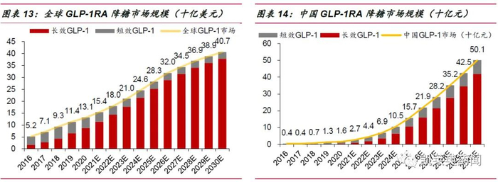 其中,GLP-1RA 药物在糖尿病市场的占比不断提升。根据弗若斯特沙利文数据,2016-2020 年全球GLP-1RA 市场由52 亿美元增长至131 亿美元,复合增长率为25.9%,中国GLP-1RA 市场从4亿元增长至16 元亿元,复合年增长率高达46.9%,远高于糖尿病用药整体市场增长率。到2030 年,全球GLP-1RA 降糖市场规模有望超400 亿美元,中国市场有望超500 亿元。