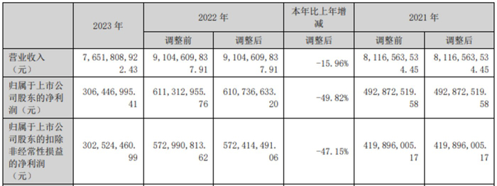 4月24日晚间,宝武镁业(002182.SZ)发布了正式归属“宝武系”后的首份年报。根据年报内容,宝武镁业2023年实现营收约76.52亿元,同比下降15.96%;对应归母净利润约3.06亿元,同比大降49.82%;基本每股收益0.46元,同比减少51.38%。
